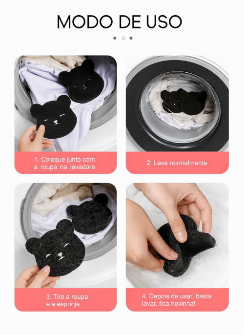 A esponja atrai e retém os pelos durante a lavagem, deixando suas roupas bem mais limpas e macias. Basta colocar junto com as roupas na máquina e ela faz o trabalho sozinha! Fora da máquina, é só passar na roupa e ponto! Não danifica o tecido e não solta fibras.
